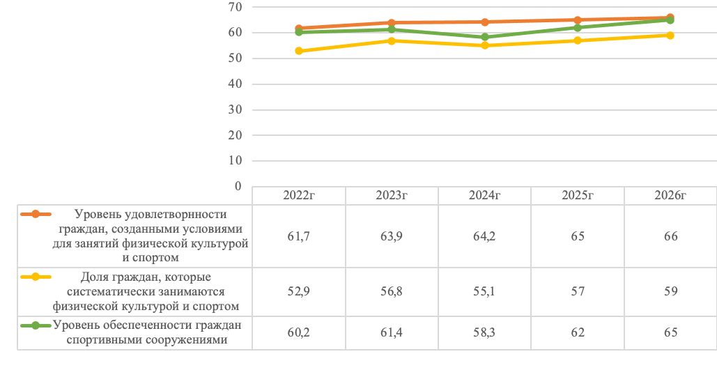 Рисунок 2. Уровень удовлетворённости, доля граждан занимающихся спортом, обеспеченность спортивными сооружениями 2022-2026 гг.