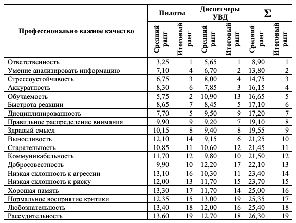 Какие же личностные качества выделяют как ПВК сами пилоты? Для этого Е. Е. Поповым, М. В. Яковлевым и И. Э. Абязовым был проведён экспертный опрос 20 пилотов из коллективов авиакомпаний ФГУП "ГТК Россия", ОАО "Аэрофлот", ОАО АК "Трансаэро", ОАО "Авиакомпания Сибирь", ООО "Лукиавиатранс", ООО "Авиакомпания "ВИМ-Авиа". Испытуемым предлагались 19 качеств человека, выбранных на базе анализа специальной литературы, которые они должны были разместить в порядке их значимости как ПВК пилота. Данные и результаты исследования представлены в табл. 1.