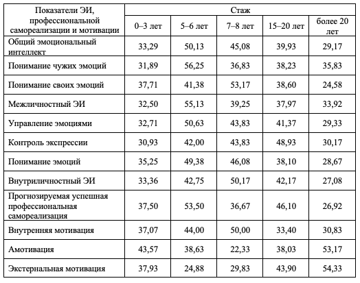 - Максимальные показатели общего ЭИ, понимания чужих эмоций, межличностного ЭИ и профессиональной самореализации характерны для специалистов со стажем 5–6 лет. Пик понимания своих эмоций и внутриличностного ЭИ, а также внутренней мотивации достигается к 7–8 годам стажа.