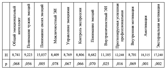 Показатели по пониманию своих эмоций (p=0,005) и внутриличностный ЭИ (p=0,025) имеют высоко значимые различия, подтверждая динамику развития самосознания на разных этапах стажа. Прогнозируемая успешная профессиональная самореализация (p=0,016): также значимо различается между группами, что указывает на изменение удовлетворенности профессией. Показатели по амотивации (p=0,001) и экстернальной мотивации (p=0,002) демонстрируют очень высокие уровни значимости различий, подтверждая трансформацию мотивационных стратегий в зависимости от стажа.