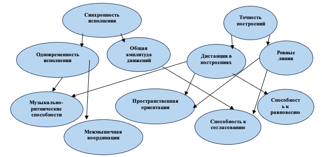 Таким образом, мы выделили взаимосвязь компонентов соревновательной композиции и основных координационных способностей, способствующие лучшему освоению композиций команд «формейшн» женщины (рис. 1).