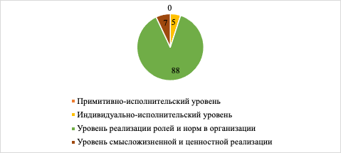 На графике 1 мы можем видеть, что большинство психологов (88%) находятся на уровне реализации ролей и норм в организации. Лишь 7% респондентов на уровне смысложизненной и ценностной реализации, что указывает на потребность в создании условий для развития внутренней мотивации и раскрытия потенциала специалистов. Индивидуально-исполнительский уровень диагностирован у 5% психологов, принимавших участие в нашем исследовании. Примитивно-исполнительский уровень профессиональной самореализации не был выявлен у респондентов нашей выборки.