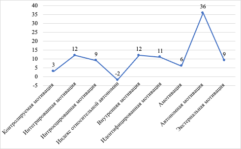 На представленном выше графике мы видим, что профиль мотивации психологов в целом позитивен, так как доминируют автономная (36), внутренняя (12) и интегрированная (12) формы мотивации. При этом фиксируется слабое влияние внешнего контроля (3) и умеренная зависимость от внешних стимулов (экстернальная – 9). Определенную тревогу вызывает отрицательный индекс относительной автономии (-2), указывающий на наличие группы специалистов, для которых внешняя регуляция значимее внутренней. Низкий, но заметный уровень амотивации (6) отражает риск эмоционального выгорания у части выборки.