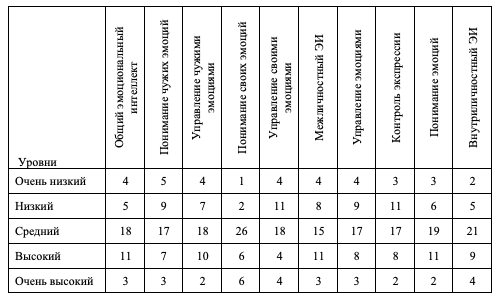 У большинства психологов преобладают средние уровни развития, особенно в таких компонентах, как понимание собственных эмоций и внутриличностный ЭИ. А вот управление эмоциями (как своими, так и чужими) и контроль экспрессии чаще остаются на низких или средних уровнях.