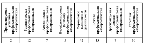 В таблице 2 мы видим, что наиболее распространенная форма профессиональной самореализации у психологов – формальное выполнение деятельности (42%), что говорит о недостаточной вовлеченности и эмоциональной насыщенности их профессиональной жизни.