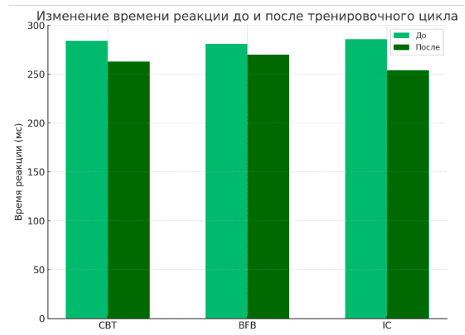 На рисунке 2 представлена динамика времени реакции до и после тренировочного цикла.