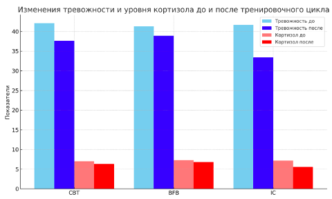 - Группа IC (интеграция CBT и BFB с применением VR/AR и нейрофидбэка) обеспечила наиболее значительное снижение тревожности (–19,9 %) и кортизола (–22,2 %), что указывает на высокую эффективность мультимодального подхода в формировании психологической устойчивости.