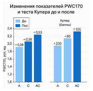 - Группа AC (интегративный подход с применением VR-тренажёров, биообратной связи и коучинга) достигла наивысших результатов: +0,53 усл. ед. по PWC170 и +325 баллов в тесте Купера. Это свидетельствует о синергетическом эффекте, обусловленном комплексной активацией как осознанных, так и автоматизированных адаптационных ресурсов спортсмена.