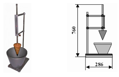 Экспериментальная часть. Предварительно для каждого из составов при использовании стандартного конуса (рис. 1) определен оптимальный расход воды для получения одинаковой подвижности Пк2. Далее исследованы такие показатели как водопоглощение, прочность на сжатие и величина адгезии. Водопоглощение по массе определено по стандартной методике. Прочность на сжатие определялась путем испытания образцов кубов с ребром 7,07 см на стандартном прессе. Величина прочности сцепления (адгезия) с основанием определена при помощи прибора ОНИКС-1.АП. [1; 2]