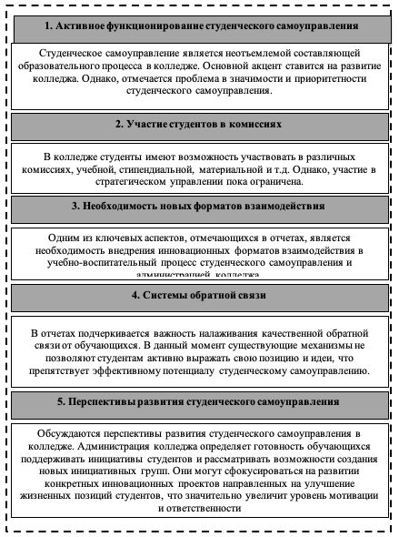 В соответствии с представленными данными проведем анализ организации студенческого самоуправления на примере, Государственного автономного профессионального образовательного учреждения Свердловской области «Колледж управления и сервиса «Стиль» [2]. Проведенный анализ официального сайта образовательной организации, отчета по самообследованию за 2023 и 2024 год можно выделить ключевые аспекты развития студенческого самоуправления (рис. 1).