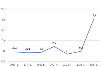 Для оценки финансовой устойчивости рассчитан коэффициент автономии, путем деления собственного капитала на активы [3]. На протяжении большей части анализируемого периода его значение было критически низким (ниже нуля). К концу 2024 года ситуация кардинально улучшилась: Кавт = 4 727 / 28 009 = 0,17. Хотя это значение все еще ниже нормативного (значение выше или равно 0,5), положительная динамика очевидна. Предприятие перешло из состояния высокой финансовой зависимости в зону неустойчивого, но улучшающегося финансового положения.