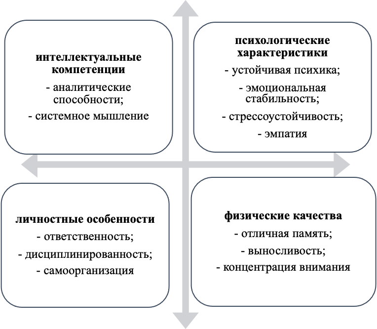 Данные личностные качества находят отражение как в различных исследованиях [4; 5, с. 55], так и в профессиограмме анестезиолога, которая представляет собой систематизированный перечень требований к специалисту и формируется на основе комплексного анализа его профессиональной деятельности.