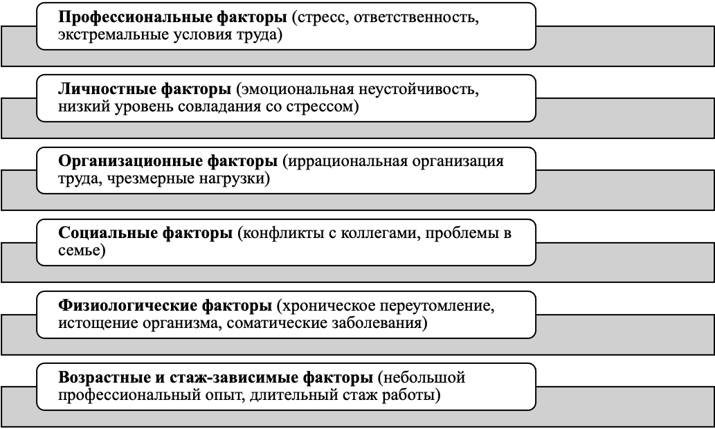 Воздействие комплекса неблагоприятных профессиональных факторов значительно увеличивает вероятность развития стрессовых реакций у врачей-анестезиологов, что становится катализатором формирования зависимого поведения и нарушений психической адаптации, которые, в свою очередь, порождают целый ряд негативных последствий, включающих существенное снижение результативности и качества профессиональной деятельности, деструктивные изменения личностных характеристик специалиста, прогрессирующее ухудшение состояния здоровья, возникновение конфликтных ситуаций в профессиональной среде, осложнение коммуникации с коллегами, нарушение взаимодействия с пациентами и проблемы в общении с родственниками больных [3, с. 156].