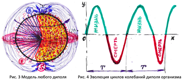 Сложно не согласиться с тем, что каждое живое существо, как единый диполь собственных структурных единиц той или иной формы, имеет не только видовой, но и строго индивидуальный (фамильный) период колебаний в своей эволюции, как система зарядов. Как зима и лето, расцвет и угасание или появление и опадание листвы на ветвях деревьев. Но ведь человек не дерево, которое всегда остаётся на зиму в одной и той же субстанции почвы. Значит ли это, что мы, как и многое вокруг, вовлечены совершенно в другие течения событий, которые идентифицируют нас в своих процессах взаимодействий, как непосредственную связь, единение с нашими образами в магнитной памяти самой материи окружения, как информацией её глобального электромагнитного поля. Где фазы «жизни» и «смерти» неотъемлемо присутствуют в своей строгой череде, как бесконечный ход развития вибраций внутренней среды конкретной структуры в условиях среды подвижного электромагнитного поля внешнего пространства (см. Рис. 4). Когда один и тот же источник пульсаций непременно принуждается к жизни извне в точной своей копии снова и снова, пока не исчерпана сама «идея», как программа, его появления здесь и сейчас, как единой вибросистемы диполя электрических зарядов. Имеется в виду не точная копия облика того или иного вида, который так или иначе подвержен мутациям, а спектр излучения этого организма, который строго индивидуален, как «имя» любой формы, которое для всех, кстати, тоже есть гармоника сочетания различных частот звуковых волн. Подтверждает ли это то, что реинкарнация действительно существует? Однако, это совсем не значит, что каждый объект «вечен» и может всякий раз «воскрешаться» бесконечное количество раз, пусть даже не осознавая собственную принадлежность к подобному процессу, как начало своего «очередного» времени «с чистого листа». Потому что любые изменения вовне, не приемлемые для самого существования этой формы, могут прервать цепочку событий, какой бы длительный период до этого они не происходили. Но её образ навсегда будет запечатлен в магнитных «архивах» множества различных диполей материи данного пространства. И это уже связано исключительно с отсутствием потребности в данном источнике энергии в конкретное время и в конкретном месте в реально изменившихся условиях взаимодействий, как запросах теперь на новые, иные «движения» в пространстве внешнего поля. Которые всегда преобразуются и возникают по одним и тем же принципам влияния электрических зарядов.