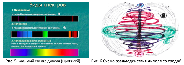 Два электрических поля и два магнитных в каждом диполе, как системе, создают взаимно перекрещивающиеся две пары колебательных контуров, энергия в которых постоянно перетекая из одного состояния активности в другое, как электрический заряд в информацию и наоборот, взаимодействует между ними циклично и строго квантовано, притом в каждом из этих пар с разной частотой колебаний. Что не только позволяет сохранять собственную форму диполя, но и взаимодействовать с зарядами вовне.