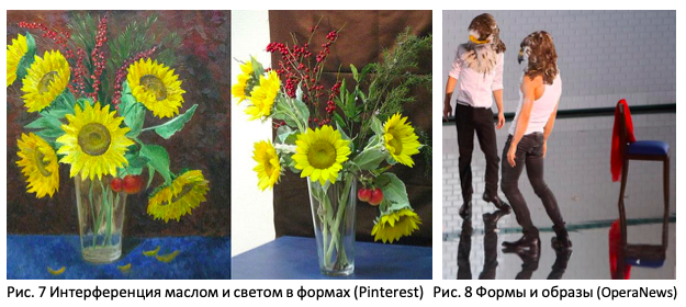 Следовательно, изначально запущенные вибрации, как движения (сжатие - расширение) в каждой Вселенной многократно возросли, размножились, расщепились и объединились, создав всё материальное (реальное) и отражённое (образы) в пространстве нашего окружения сегодня, как от «протоматерии» до настоящего времени. И даже совсем не обязательно, что от любой конкретной формы, а хоть просто от его отображения (воспроизведения). Когда образы или иллюзии - есть отражения от материи среды, как информация, а реальные физические формы – это процессы взаимодействия магнитных и электрических полей с последующими перестроениями зарядов в самой материи окружения, способные к развитию, эволюции, как движению диполей их структуры. Но одно постоянно переходит в другое и наоборот, в зависимости от условий самого пространства присутствия. Когда при взаимодействии зарядов из информации вполне себе выстраиваются реальные формы, в том числе живых организмов. Потому что, любой объект оставляет в пространстве окружения «свой след» всегда, как собственное отображение в структурах диполей его материи. Когда источники и образы излучают и отражаются одновременно, но по-разному, и не только в объёмах и интенсивности, но и в направлении распространения. Когда одно явление возникает мгновенно, как хиральность от формы, а второе – выстраивается постепенно в строгой своей очерёдности происходящих событий (см. Рис. 8). Как процесс синтеза множества объектов с целью создания полной копии вибросистемы источника излучения со всеми его свойствами и характеристиками в движении или развитии всегда, когда происходит видовой резонансный «отклик» всех колебательных контуров его состава, как репликация всего объекта в пространстве.