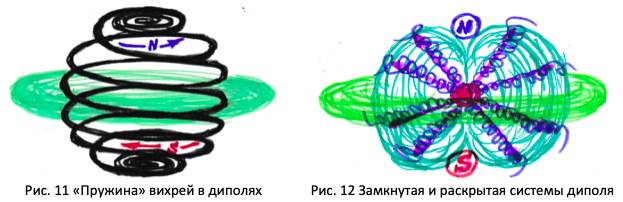 Именно взаимодействия различных диполей зарядов множества «Корониев» образуют общий магнетизм среды окружения, который, как хранитель образов информации обо всех движениях вокруг, так или иначе оказывает управляющее влияние на любые изменения, как «всплески» их энергии в пространстве, тут же стремясь создать процессы к противодействию, как побуждение к балансу. Именно подобным образом возникает подвижная «материальная» Вселенная. Впрочем, как и звёздные системы или структуры атомов, молекул, ядер, элементарных частиц, - всё, что называется «сутью», с их идеальной «балансировкой» вихревых систем, с множеством разных орбит и спутников в результате тысячелетних периодов эволюции. Потому что в любых вихрях работают законы маятников, как колебаний, когда в их вибросистемах каждого объекта потенциальная энергия по любому переходит в кинетическую и наоборот, пока движение, как его форма, существует. И это работает везде, как сжатие – расширение, заряд – разряд энергии, подобно невидимой пружине в их «часовом механизме», которая сжимается от большого вихря формы диполя на экваторе к малому на полюсе одном и разжимается на противоположном, передавая энергию от одного к другому вдоль собственной оси вращения (см. Рис. 11). Гениальный механизм, созданный самой природой технологии вихрей, когда центростремительные и центробежные силы присутствуют одновременно, всегда, в любых колебательных системах (вихрей). Только нарушив этот процесс можно разрушить форму данного диполя, переформатировать его. Когда вращения «вправо-влево» на противоположных полюсах не дают затухнуть колебаниям всего диполя, когда полюса в каждом таком периоде в обязательном порядке меняются, запуская механизм переменного направления его магнитных силовых линий навстречу друг другу в каждый момент такой переполюсовки. Знак заряда, как направление вращения вихря электрического поля, при этом не меняется, остаётся прежним. Изменяются только потоки зарядов вдоль оси к полюсам «N» и «S». И это работает всюду, во всех формах вибросистем.