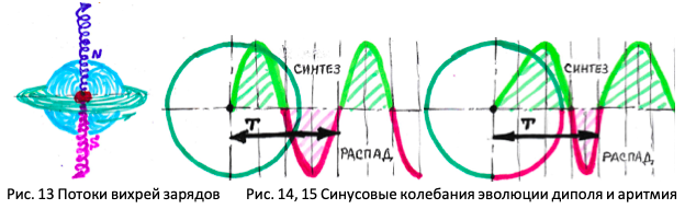 Известно, что опережение интенсивности вибраций (вращения вихрей) одного полюса над другим в диполе при взаимно перпендикулярных позициях колебаний волн достигает 90° или 1/4Т (периода). Выходит, что с переходом потенциальной энергии магнетизма в кинетическую электричества и наоборот, этого вполне достаточно для поддержания незатухающих колебаний своего рода «энергетической пружины» в архитектуре криволинейных вихрей разного вращения в её диаметральных полусферах. Когда один поток энергии вихря существует за счёт другого, как два напряжённых состояния, полярные друг другу, как «тени» вихрей магнетизма противоположных поясов. Когда электрический вихрь внешнего поля на экваторе диполя разделяет эти два потока своего рода магнитного «равновесия». Захватывая заряды извне и поглощая их внутренними потоками круговоротов обоих полушарий для преобразования в противоположные спины в центре системы с целью усиления магнитных полюсов, которые всегда своей энергией попеременно поддерживают то один, то другой её вихрь в собственном ритме вибраций. Как энергия «подвижности» (ориентации) объекта, как фактор постоянного дисбаланса, в результате чего за счёт попеременной разрядки заряжается то один поток, то второй. Как смена полюсов диполя в своём стремлении к равновесию собственной вибросистемы. Когда новые порции зарядов извне всякий раз изменяют состояние, разбалансируя его вновь и вновь. Когда нейтральный диполь - без заряда вовне, разряжен, взаимоскомпенсирован. Но стоит получить любой импульс (заряд) извне, как тут же система полушарий (полюсов) дестабилизируется вновь и станет снова взаимодействовать с объектами окружения. Однако, равновесие ни в коем случае не означает потерю всякого движения, оно ни коим образом не исчезает во всех структурах. Но, прекращается процесс преобразования вещества внутри диполя в его центре, где царит «пустота» вакуума, как и в самом фокусе ядра любого атома, как вибросистемы вихря. Происходит разделение на два противоположных потока зарядов от центра к полюсам, как в узконаправленных пучках пульсаров (см. Рис. 13). И, если в реальности всё вокруг нас является лишь отражением (образами) прошлого на величину удаления от нас самих этих объектов, то это всего лишь сигналы магнетизма к взаимному контакту, как информация, но не более того.