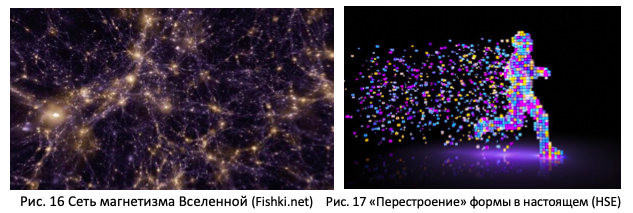 Силовые линии магнетизма взаимодействующих зарядов, выстроенные между всеми вихрями множества форм в пространстве, образуют определённую сеть своего рода электрических связей этих диполей между собой, как единую вибросистему общего электромагнитного поля Вселенной (см. Рис. 16). И эти процессы постоянно видоизменяются, создавая всё новые связи, в результате которых возникают другие объекты, которые снова взаимодействуют по тем же принципам, выстраивая виброструктуры способные более активно перестраиваться именно в данных условиях среды окружения, вновь и вновь. Всё более уплотняя и «сдавливая» собственные возникшие формы новой архитектуры силовыми линиями магнетизма и увеличивая своё влияние на природу пространства вовне.