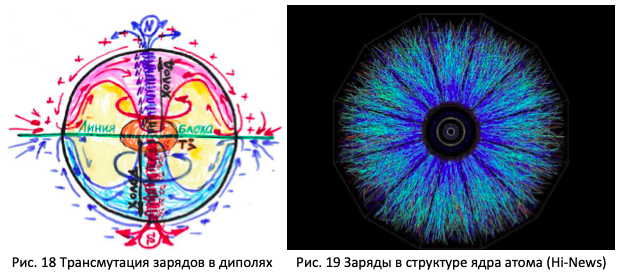 Следовательно, в какой-то мере любая «вещь» бесконечно повторяется в других и все они едины, потому что образованы из одного и того же в одном и том же сплошном пространстве. Разве каждая спираль в диаметральных полушариях любого диполя не состоит из «негатива», как расширения, и «позитива», как сжатия, подобно эксплозии и имплозии в одной форме какого бы то ни было объекта, которые присутствуют там всегда? Когда «захват» (всасывание) зарядов извне втягивает их в вихри противоположных полюсов («минус» к «плюсу» и наоборот), ускоряет и перевоплощает каждый из них в центре сферы в элементы не только другого спина, но и состава, «выстреливая» эти излишки вдоль собственной оси вращения вовне. Как процесс усиления магнетизма формы с расщеплением полученной таким образом энергии частот различных спектров излучений извне пространства, через внешнюю оболочку её раскрытой системы, в частоты вихрей видовых структур замкнутого состава данного диполя с выделением избытка энергии вовне через его полюса (см. Рис. 18).