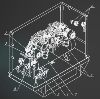 1 – компрессор, 2 – электрический привод, 3 – рамный блок; 4 – электромагнитный клапан; 5 – датчик КИПиА, 6 – ёмкость для сбора конденсата, 7 – фильтр-каплеуловитель.