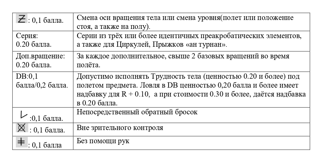 Но динамический элемент с вращением мог быть увеличен в стоимости, если гимнастка показываладополнительные критерии в ходе выполнения «риска», представленных в таблице 1.