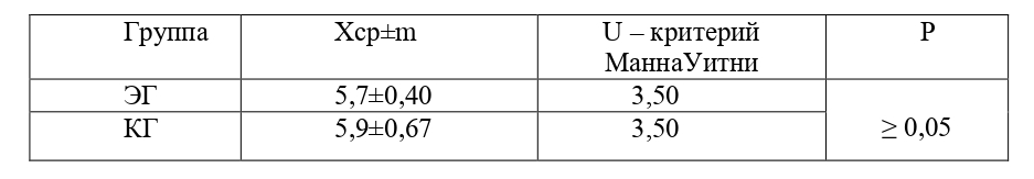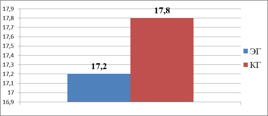 По данным таблицы видно, что по уровню трудности обе группы однородны, у контрольной и экспериментальной групп различия уровня признака статистически не значимы (p ≥0,05). Учитывая, что стоимость одного динамического элемента с вращениями около 1-1,5 балла, мы также можем видеть, группы отличаются не значимо и не существенно по экспертной оценке, выраженной в баллах (рисунок 1).