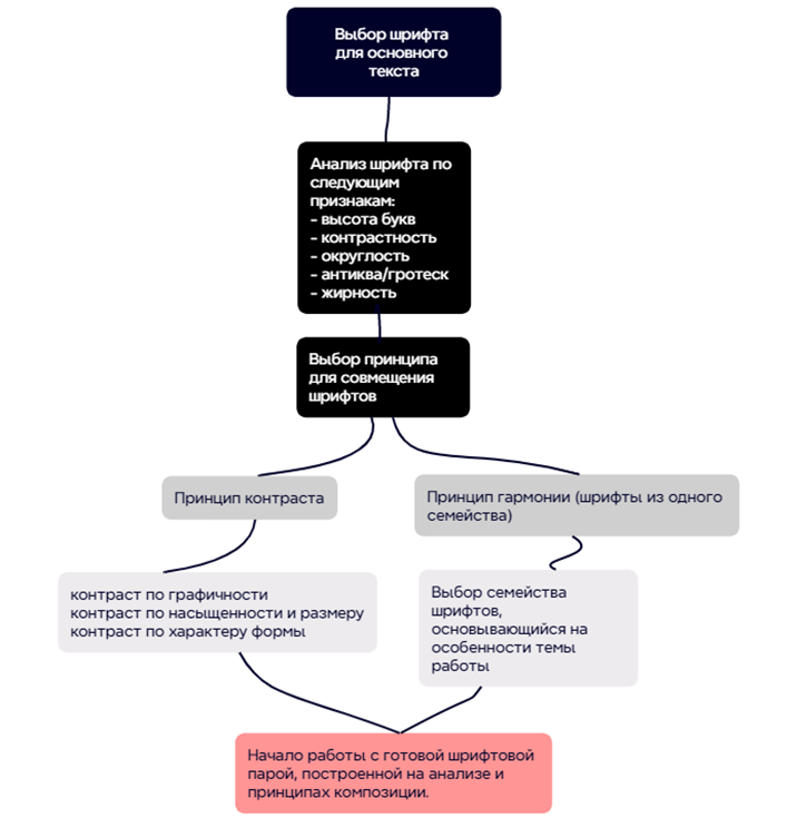 Автор составил подробную интеллект-карту, которую можно использовать как универсальную шпаргалку для составления гармоничных шрифтовых пар. Во-первых, следует выбрать шрифт для основного текста, так как он будет занимать самый большой объём в работе, это позволит дизайнеру определить для себя отправную точку, от которой начнется анализ и последующие действия для составления пары. Этот пункт можно сравнить с выбором темы любого проекта, так как его можно считать основополагающим в поставленной задаче. Далее нужно перейти к анализу, о котором упоминалось выше. Полученные данные после этого этапа позволяют логично составить портрет шрифта, который будет использоваться, и уже после этого дизайнер переходит непосредственно к процессу подбора пары.