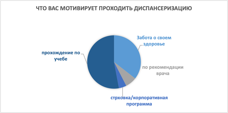 На рисунке 3 представлено, что мотивирует студентов к прохождению диспансеризации: 13 студентов (37,71%) указали заботу о своем здоровье, 3 опрашиваемых (7,32%) ответили по рекомендации врача, 2 анкетируемых (4,88%) указали на наличие страховки или корпоративной программы, 23 обучающихся (56,1%) ответили, что проходили диспансеризацию в связи с необходимостью обучения (рисунок 3).