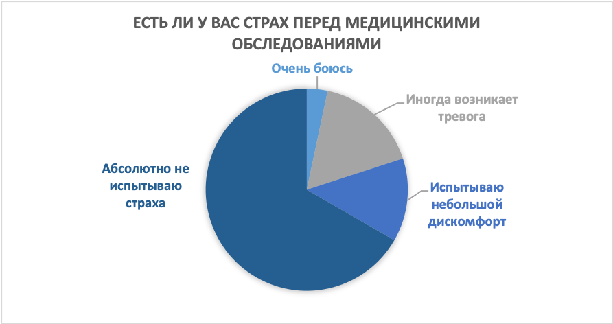 На вопрос о наличии страха перед медицинскими обследованиями 1 студент (3,33%) ответил, что очень боится, 5 опрашиваемых (16,67%) ответили, что иногда возникает тревога, 4 респондента (13,33%) испытывают небольшой дискомфорт, 20 обучающихся (66,67%) абсолютно не испытывают страха (рисунок 6).