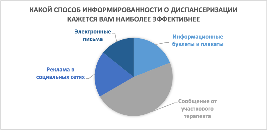 Наиболее эффективным способом информирования о диспансеризации 8 студентов (19,05%) считают информационные буклеты и плакаты, 20 опрашиваемых (47,62%) – сообщение от участкового терапевта, 8 анкетируемых (19,05%) – реклама в социальных сетях, 6 обучающихся (14,29%) – электронные письма (рисунок 7).