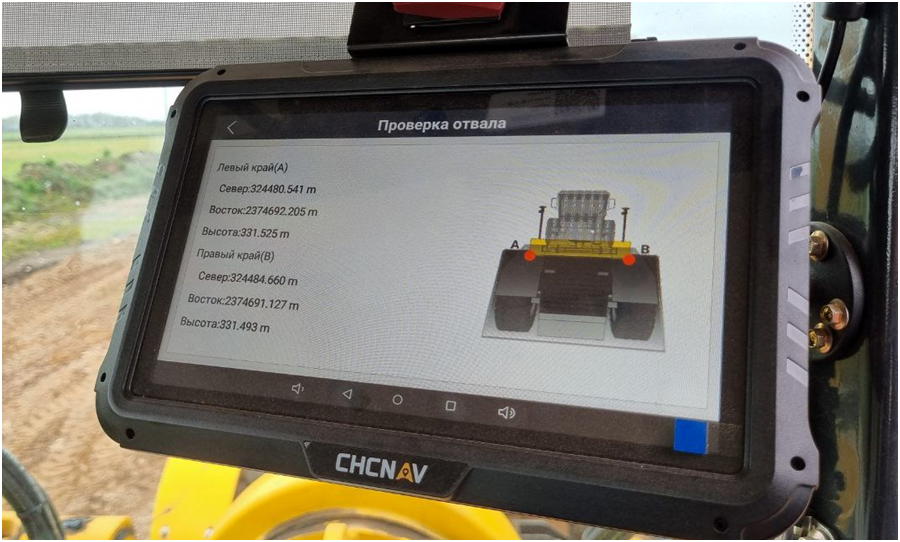 Для окончательной работы и правильности работы 3D системы нужно сделать калибровку системы по высоте. С прибором EFTE1 встаем на левую сторону ножа отвала и фиксируем X,Y и высоту.