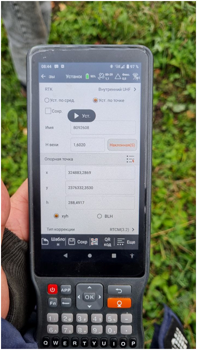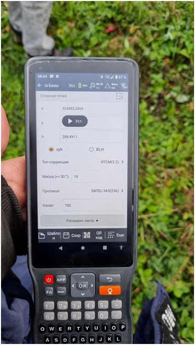 На верхний части меню панели отображается проект, количество видимых спутников составляет 44 из 44 совместных с базовой станции.