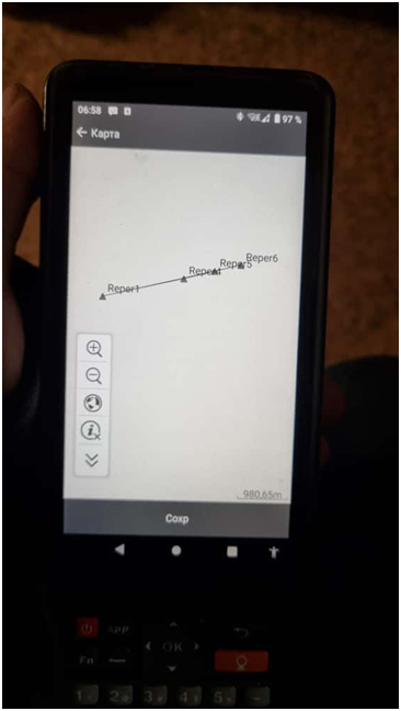 После всех действии система 3Dнивелирования готова к работе, запускается автогрейдер на участок и делается контрольная проверка отметок, после прохождения по рабочему слою. Грейдерист поставил отметку выше 3 см и после проверки прибором EFTE1 показатель так же 3 см.