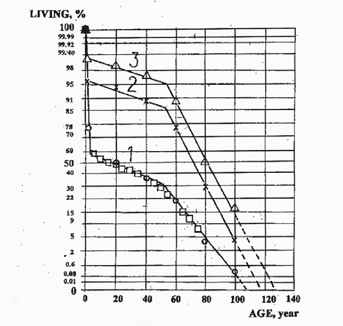 На Рис. 1 представлены когортные графики дожития во Франции, построенные в координатах рахистохронной бумаги {% живых – возраст}: 1 - ранняя французская таблица (XVIII в.), дополненная данными (□) таблицы Галлея (XVII в.); 2 - французская таблица (середина XX в.); 3 - гипотетическая "биологическая" таблица демографической службы ООН.