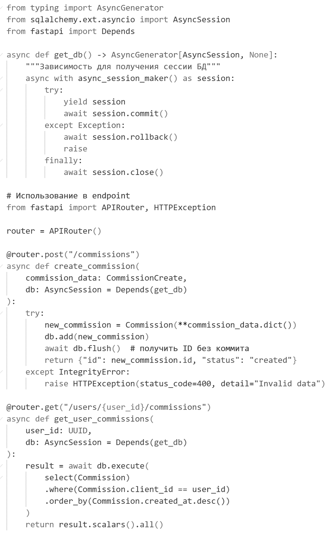 Функция get_db автоматически управляет жизненным циклом сессии: создает, коммитит при успехе, откатывает при ошибке и закрывает. FastAPI инъектирует сессию в каждый endpoint через параметр Depends.