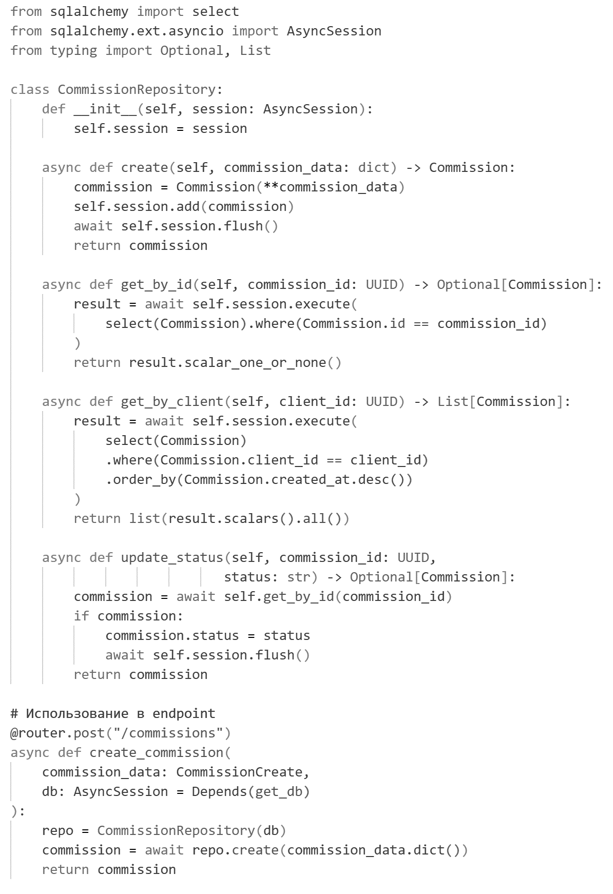 Repository содержит все операции с Commission, изолируя детали работы с БД от бизнес-логики. Методы легко тестируются и переиспользуются.