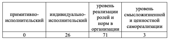 Конструктивные типы профессиональной самореализации представлены лишь у 9% работников, что указывает на недостаточный кадровый резерв для развития инновационной деятельности и управленческих компетенций.