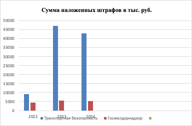 На графике 1 мы видим сравнение эффективности наложения административных штрафов отделом Транспортной безопасности и Госжелдорнадзором с 2022 года по 2024 год. Из графика 1 мы видим преимущества постоянного рейда в контрольно-надзорной деятельности, которые заключаются в возможности непрерывного контроля за соблюдением обязательных требований. Инспекторы транспортной безопасности могут постоянно проводить контрольно – надзорные мероприятие, где доступ инспекторов ограничен, что важно для предупреждения, выявления и пресечения нарушений. Таким образом автор предлагает ввести изменения в Положение о государственном железнодорожном контроле (надзоре), дополнить его разделом постоянный рейд. Что приведет к более качественному проведению контрольно-надзорных мероприятий. Например, сотрудники госжелдорнадзора смогут проводить проверки железнодорожного подвижного состава в части соблюдения требований пожарной безопасности, доступной среды для инвалидов и маломобильных граждан, проверки железнодорожных переездов что должно уменьшить количество транспортных происшествий.