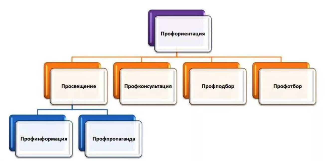 Профессионально-ориентированные мероприятия могут быть различных типов: консультации, тестирование, вводные уроки, знакомство с профессиональной деятельностью, экскурсия и др. На рисунке ниже обозначены основные типы мероприятий по профессиональной ориентации.