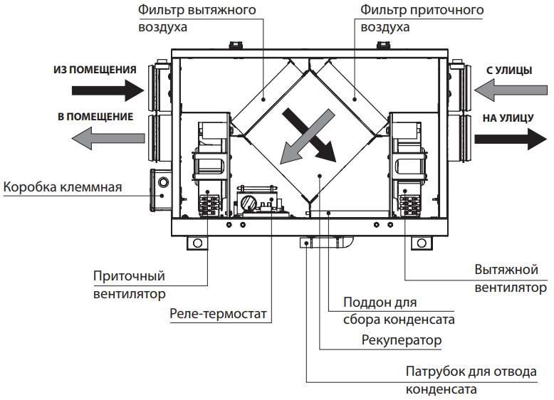 Рисунок 1. Схема устройства приточно-вытяжной установки с пластинчатым рекуператором