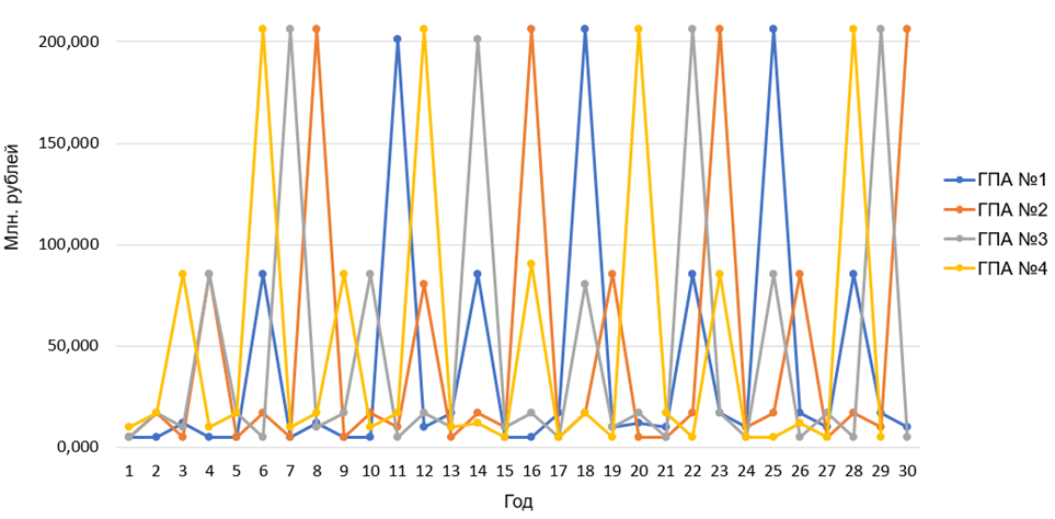 Капитальные затраты определены на основе удельного показателя стоимости 1 МВт установленной мощности, актуального для практики ПАО «Газпром» (около 182 млн руб./МВт на 2025 г.). Для установленной мощности 128 МВт общий объём капитальных вложений составил 23,29 млрд руб.Эксплуатационные затраты за 30 лет детализированы по статьям с учётом режима наработки оборудования. Это позволяет достичь наиболее точного результата. Пример распределения расходов отражен на рисунке 1.