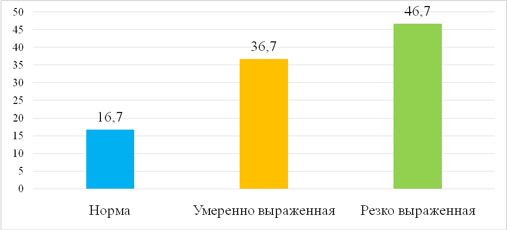 Результаты диагностики по тесту созависимости В. Д. Москаленко показали преобладание показателей выше нормативного диапазона. Норма (0–32 балла) выявлена у 16,7% респонденток, умеренно выраженная созависимость (33–60 баллов)– у36,7%, резко выраженная (61–96 баллов) – у 46,7% (см. Рисунок 1). Таким образом, у 83,3% участниц зафиксированы повышенные показатели созависимости, что отражает выраженность созависимых паттернов у жен/партнерш аддиктов.