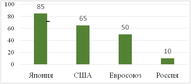 В Российской Федерации «Lean» применили на промышленных предприятиях «Росатом», в сфере кредитования и услуг ПАО «Сбербанк», «Почта России». В сфере автомобилестроения АО «КамАЗ» и «АвтоВАЗ». В топливных системах ПАО «Газпром нефть», ОАО «Татнефть». Актуально и эффективно применяются бережливые технологии в системе образования. Однако, эффективность применения бережливых технологий в России остается на низком уровне (график 1) [5, с.40-42]:
