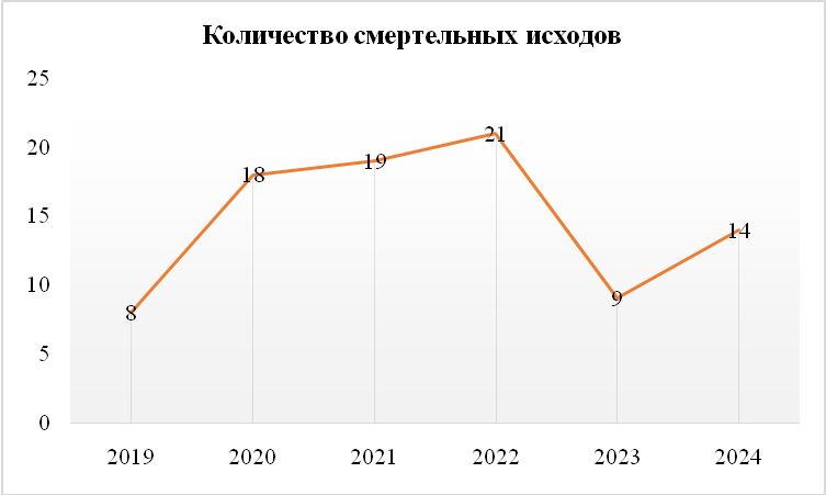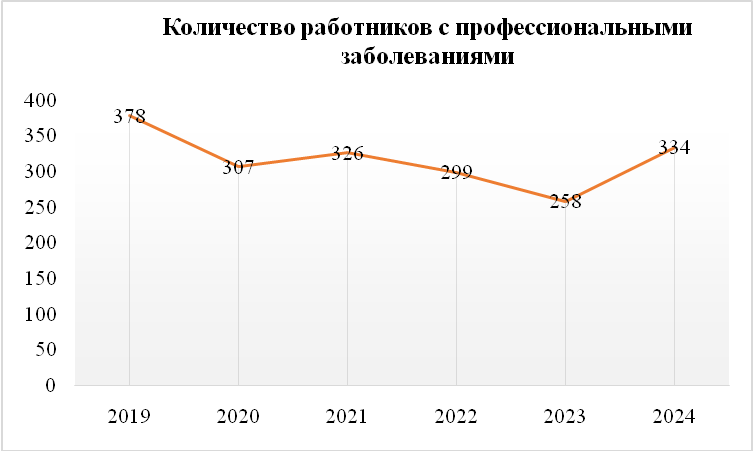 Результат проведенного исследования: количество работников, получивших профессиональные заболевания в 2019 г. – 378 человек, из которых 8 (2,1%) со смертельным исходом, 2020 г. – 307 человек, из которых 18 (5,9%) со смертельным исходом, 2021 г. – 326 человек, из которых 19 (5,8%) со смертельным исходом, 2022 г. – 299 человек, из которых 21 (7,0%) со смертельным исходом, 2023 г. – 258 человек, из которых 9 (3,5%) со смертельным исходом, 2024 г. – 334 человек, из которых 14 (4,2%) со смертельным исходом [5].