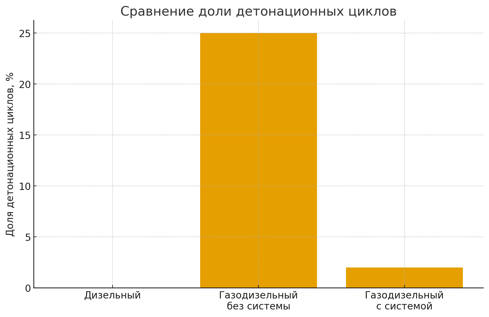 График наглядно иллюстрирует разницу в детонационной устойчивости трёх рассматриваемых режимов. В дизельном режиме доля детонационных циклов равна нулю, что соответствует штатной, отработанной конструкции двигателя. При переходе к газодизельному режиму без системы подавления детонации наблюдается значительный рост доли детонационных циклов до 25 %, что подтверждает высокую склонность метановоздушной смеси к взрывному горению при сохранении прежней степени сжатия и без коррекции тепловых и кинематических параметров. Введение системы контроля и интеркулера позволяет снизить долю детонационных циклов до 2 %, то есть приблизиться по этому показателю к базовому дизельному режиму.