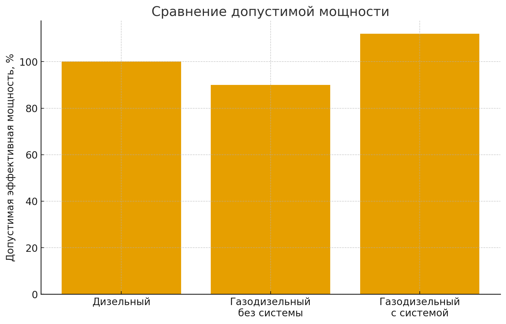График наглядно иллюстрирует,чтона графике видно, что в дизельном режиме двигатель развивает 100 % номинальной мощности. При работе в газодизельном режиме без системы подавления детонации допустимая эффективная мощность снижается до 90 % вследствие необходимости ограничивать нагрузку, чтобы не допустить разрушительных детонационных процессов. После внедрения системы контроля и интеркулера допустимая мощность возрастает до 112 % от номинала, что указывает на возможность более агрессивной настройки наддува и оптимизации процесса сгорания метановоздушной смеси при контролируемом тепловом и силовом режиме [1].