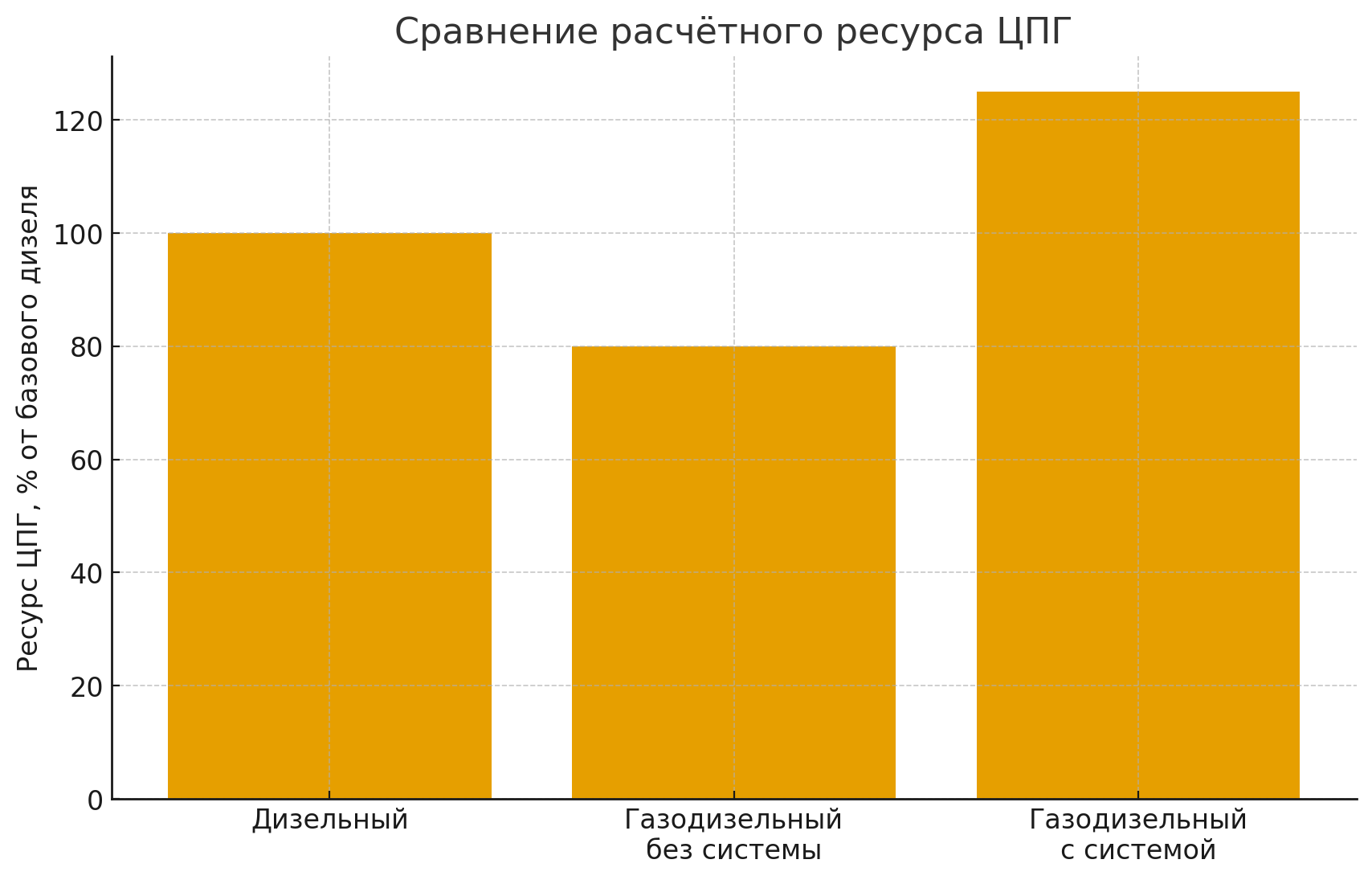 Расчётный ресурс ЦПГ, % от базового дизеля |