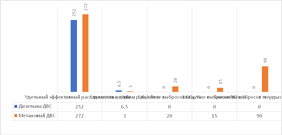 Результаты исследования. Анализ данных таблицы 1 показывает, что при переходе с базового дизельного режима на метановый двигатель удельный эффективный расход топлива возрастает (с 252 до 272 г/кВт·ч), однако это компенсируется существенно более низкой стоимостью единицы энергии метана. В результате суммарные затраты на выполнение единицы механической работы снижаются, что и обеспечивает экономический эффект от использования газомоторного топлива [4, стр. 15].