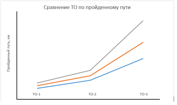 График 1 наглядно иллюстрирует, что при одинаковом пройденном пути газовый двигатель потребует наименьшего числа визитов на сервис, дизельный — больше, а газодизельный — значительно больше остальных.